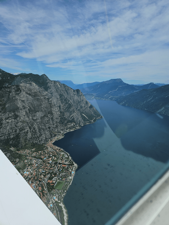 Die zweite Etappe führte südlich über den Gardasee. Der Blick aus dem Cockpit auf das funkelnde Wasser, die liebliche Uferlinie von Limone und Malcesine sowie die sich spiegelnden Alpen im Rücken war ein Genuss, den man mit keinem Linienflug vergleichen kann. In dieser Höhe, bei freier Sicht und kaum Turbulenzen, offenbart sich Italien von seiner schönsten Seite.