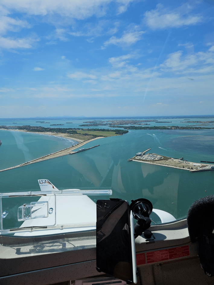 Kurz vor Mittag näherten sich die beiden Piloten der Lagunenstadt Venedig. Der Flugplatz Venezia-Lido (LIPV) bot sich ideal für einen Tank- und Mittagspausen-Stopp an. Der Funkverkehr war zu diesem Zeitpunkt – wie so oft in Italien an Feiertagen – dicht, die Verständlichkeit stellenweise eingeschränkt. Doch mit ruhiger Hand und klarer Kommunikation meisterten Willy und Chris auch diese Herausforderung. Während die Dynamic WT9 neues AVGAS bekam, gönnten sich die beiden ein schnelles Pasta-Gericht mit Blick auf die Wasserflugzeuge am Rand der Lagune.