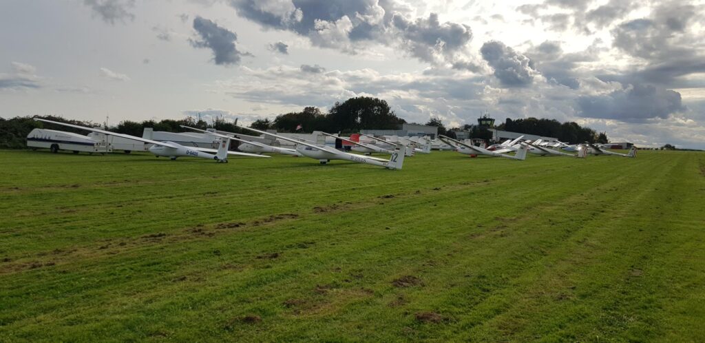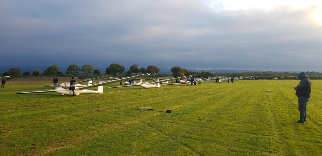 Samstag, 23. September 2023, 5:20 Uhr. Eine Wecker-App ließ ein Handy klingeln: Creep von Radiohead ertönte im Jugendzimmer des Flugplatzes Paderborn-Haxterberg. Das Handy durfte das Lied von Anfang bis Ende durchspielen, ohne dass sich eine einzige der vier müden Personen im Raum auch nur ansatzweise in Richtung des Stummschaltknopfes – oder überhaupt – bewegt hätte. Nach einer darauffolgenden Minute der Stille wurde die Frage „Alter, wer wacht denn bitte mit Radiohead auf!?“ schlaftrunken in den Raum geworfen. Leo Wrba aus dem Allgäu war der erste von uns, der langsam zu Bewusstsein kam. Im vergangenen Jahr hatte er sich beim Bayerischen Jugendvergleichsfliegen in Dachau als Nachrücker für das diesjährige Bundesjugendvergleichsfliegen qualifiziert; nun quälte er sich aus seinem Schlafsack und schleppte sich vor die Tür, um den Stand der Dinge auf dem Grasstreifen neben dem Vorfeld zu begutachten, auf dem die zahllosen Segelfluganhänger in einer Reihe parkten, die in den vergangenen Tagen aus der gesamten Bundesrepublik nach Paderborn gezogen worden waren. Kurz darauf, als Boris, der sich 2022 mit dem zweiten Platz in Dachau direkt qualifiziert hatte, und ich uns noch den Sand aus den Augen rieben, tauchte Leo wieder im Zimmer auf und berichtete von regem Treiben draußen in der Dunkelheit. Mit unseren neuen Freunden und Bayerischen Teamkollegen Leo und Michl, das war sein Helfer, machten Boris und ich uns unausgeschlafen auf den Weg zu dem Anhänger aus Bad Wörishofen. Der darin enthaltene dreirädrige Club Astir wollte aufgerüstet werden. Die Dämmerung ließ auf sich warten. Mit Taschenlampen und einem kleinen Scheinwerfer, den Leo sich auf den Kopf gebunden hatte, gingen wir an die Arbeit. Noch nie habe ich die Venus so hell strahlen sehen wie an jenem Morgen. Sie überstrahlte sogar das Licht der fernen Lampen, die an den hunderten Windrädern, die weit entfernt um den Flugplatz herum gebaut worden waren, den dunstigen Horizont rot ausleuchteten. Als wir etwa 15 Minuten im Dunkeln an dem Astir herumgedoktort hatten, der sich im nasskalten Gras trotz unserer Bemühungen und der stetig steigenden Frustration einfach nicht zusammenstecken lassen hatte wollen, kamen uns ein paar Teilnehmer aus einem anderen Bundesland dankenswerterweise zur Hilfe; weitere 20 Minuten später war das Fluggerät aus dem Hause Grob endlich startbereit. Ich war froh und den Paderbornern (und Konstantin, der das von unserer Seite aus in die Wege geleitet hatte) sehr dankbar, dass Boris auf ihrer ASK 21 fliegen durfte, die aufgerüstet in der Halle stand. Am liebsten hätten wir uns alle sofort wieder schlafen gelegt, aber dazu war der Zeitplan zu straff – und das Frühstücksbuffet zumindest für Boris, Michl und mich dann doch zu verlockend.