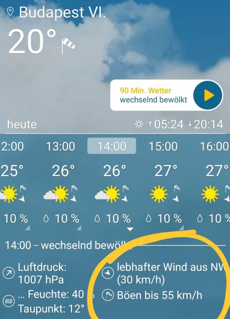 Nach einer schönen Woche in Budapest ging es am Freitag um die Planung des Rückflugs. Natürlich ist das Wetter alles andere als fliegerfreundlich. Der Wind ist katastrophal (19kts mit 30kts Böen am Flugplatz) und zahlreiche Gewitterzellen auf der Strecke.